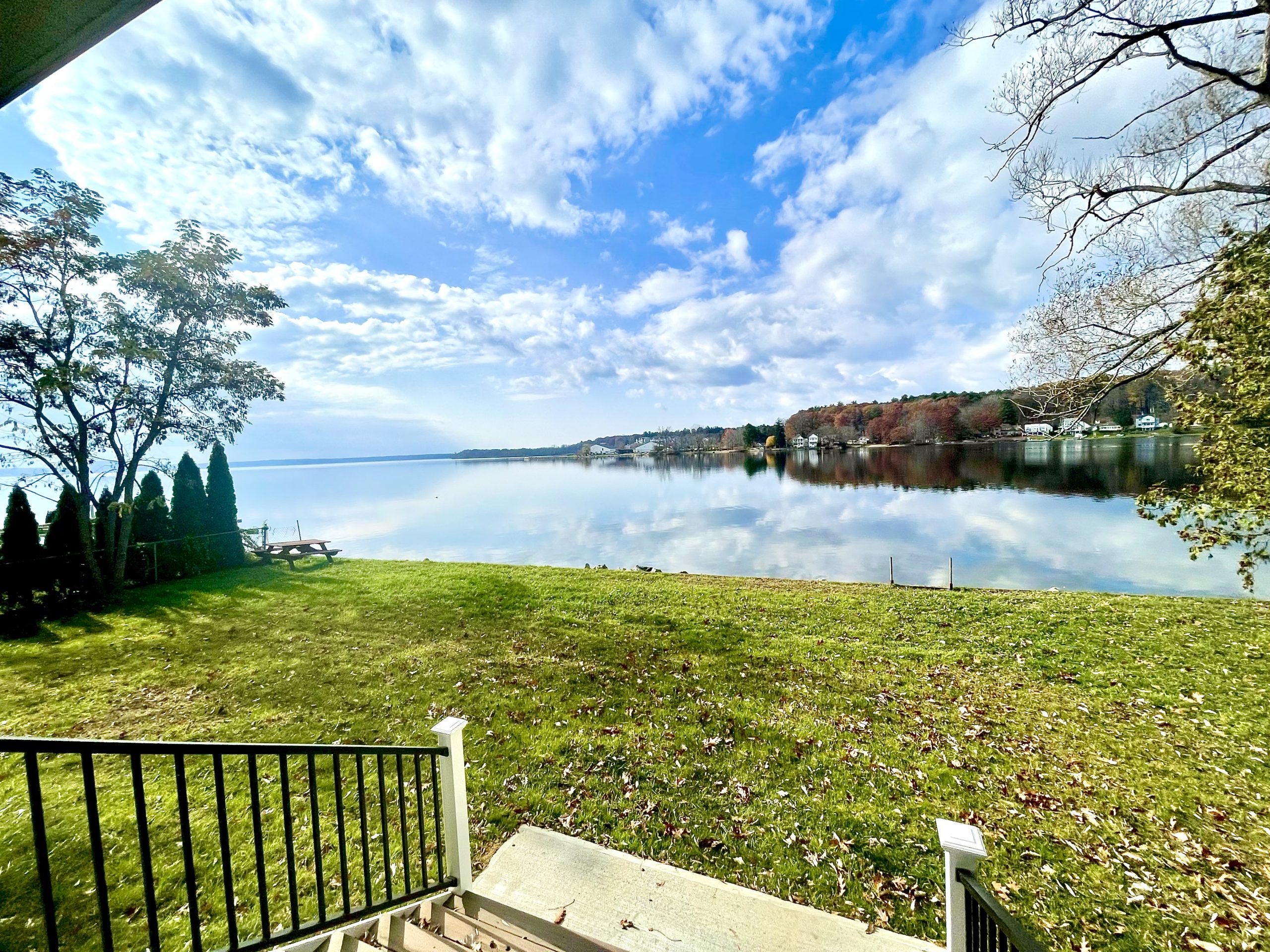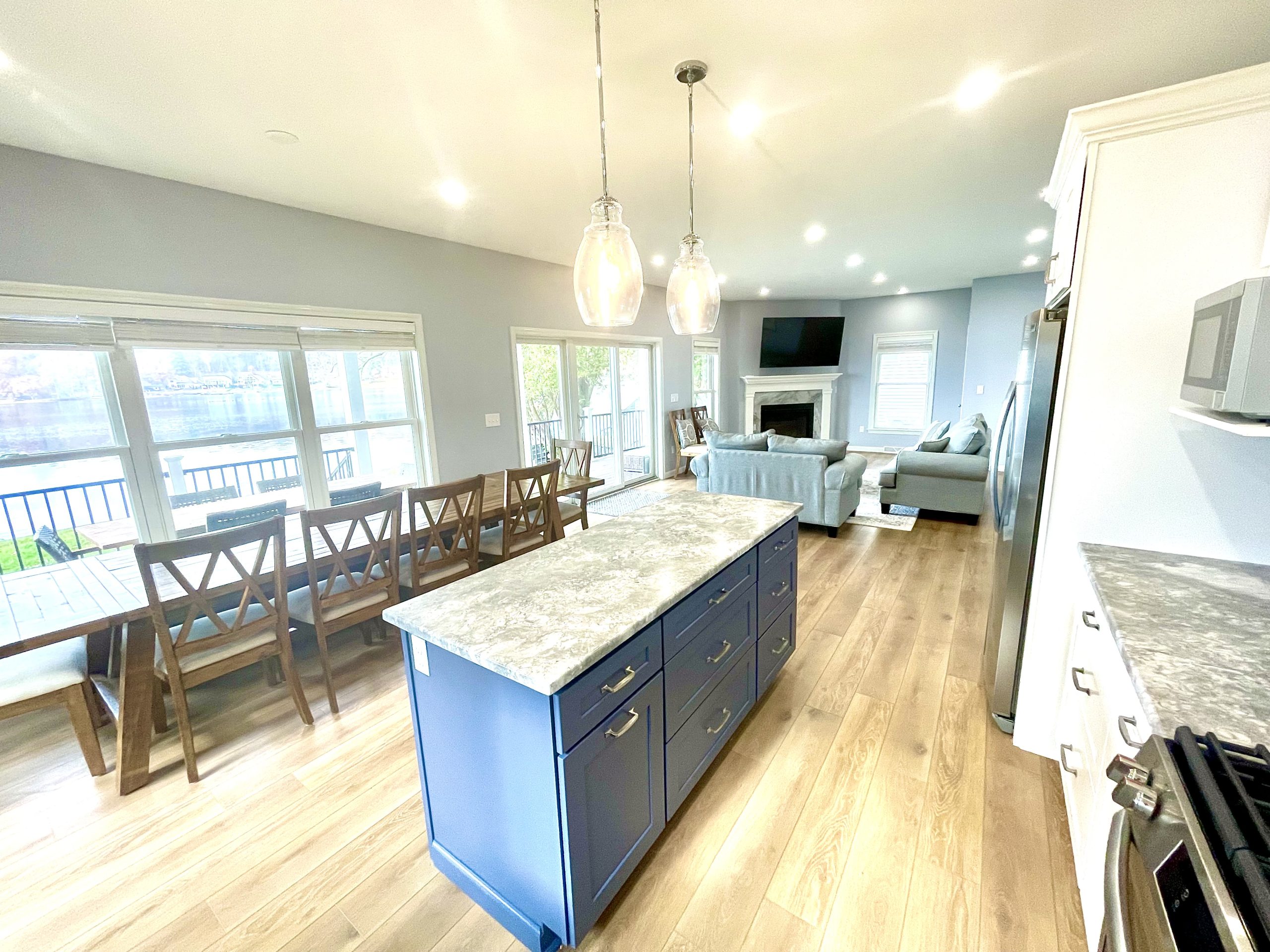 The first floor has one bedroom with a queen bed, full bathroom, kitchen, dining, and living area. Extended living space with a covered deck off the first floor with access to the lawn and lake. The seamless layout allows for indoor and outdoor dining options to enjoy the scenic views of the lake.