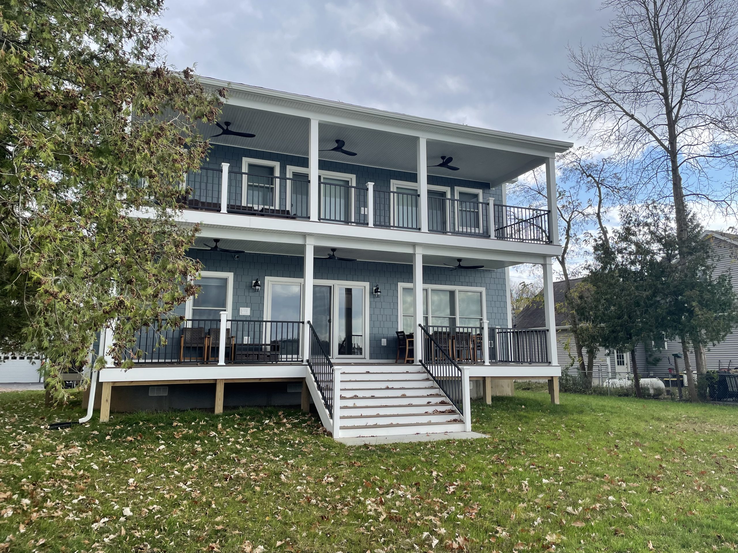 The second floor includes a washer and dryer, coffee bar, bedroom with a queen bed and twin over full bunk beds, and two lake-side bedrooms each with a Queen bed and sliding glass door to a covered deck with exceptional lake views.